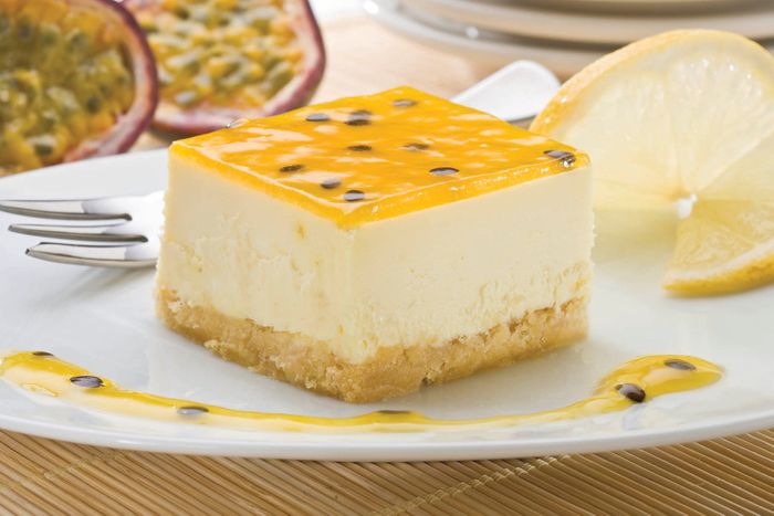 A lemon baked cheesecake covered with passionfruit on a gluten free biscuit base.