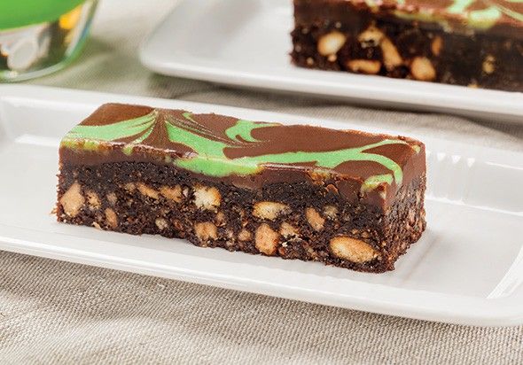 Mint flavoured hedgehog base topped with chocolate ganache finished with a swirl of minty ganache.