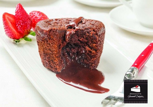 Decadent chocolate cake filled with chocolate. Warm to release the ooze.