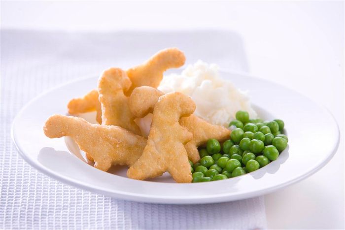 Pieces of chicken breast in a dinosaur shape, coated in a crisp tempura coating.