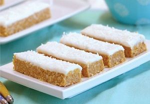 Sweet coconut biscuit base covered with tangy lemon icing topped with shredded coconut.