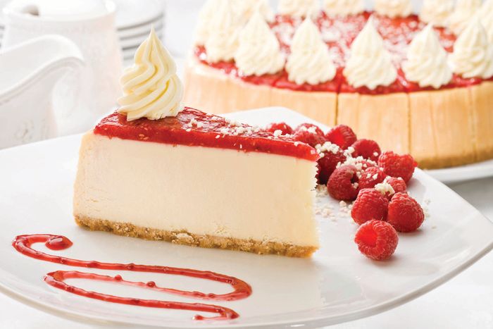 A traditionally prepared creamy New York cheesecake, topped with delicious raspberries and a white chocolate panache peak.