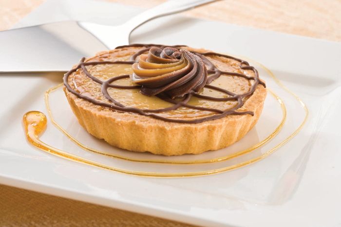Rich baked caramel filling in a fluted tart shell, finished with delicate chocolate piping and a chocolate caramel duo rosette.