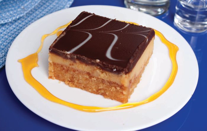 A smooth creamy caramel on a rich coconut biscuit base, finished with a feathered ganache.