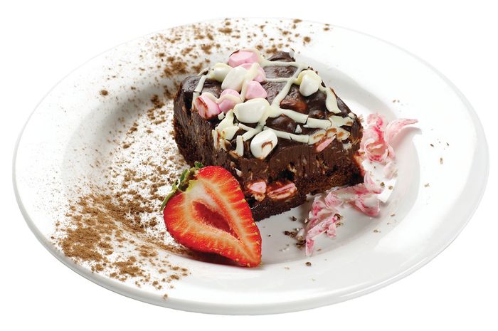 A classic rocky road mix of pink and white marshmallows, glace cherries, coconut and slivered almonds, all folded through dark ganache on a mud cake base.