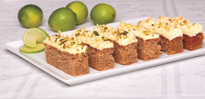 A rich blend of banana and pineapple, topped with a layer of cream cheese dressed with pistachio and banana pieces.