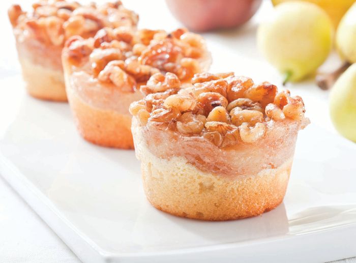 A centre of juicy pears, topped with walnuts, sitting on a base of moist poached oranges and almond meal.