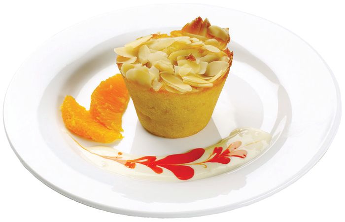 A blend of poached oranges and almond meal, topped with almond flakes and a light dusting of icing sugar.