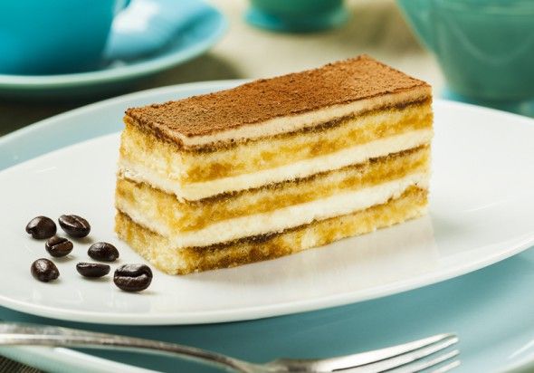 Layers of light sponge and tiramisu cream filling infused with coffee and dusted with cocoa.