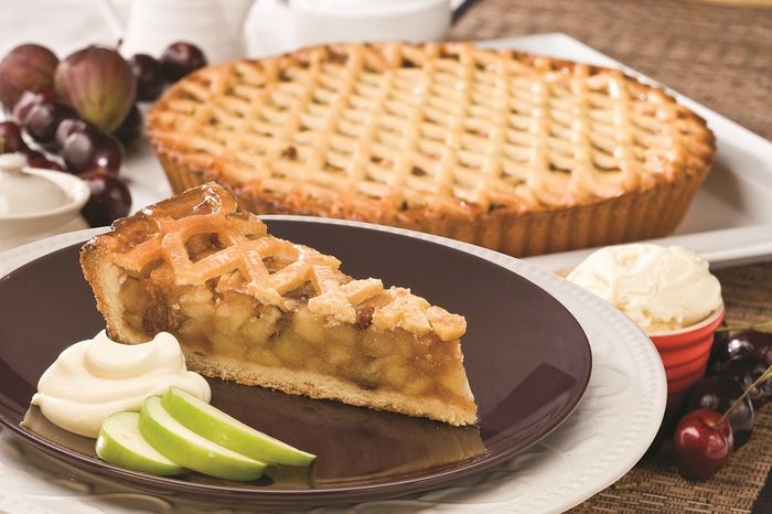 A traditional apple pie with seasonal apples, cinnamon, sultanas, spices and a pastry lattice top.